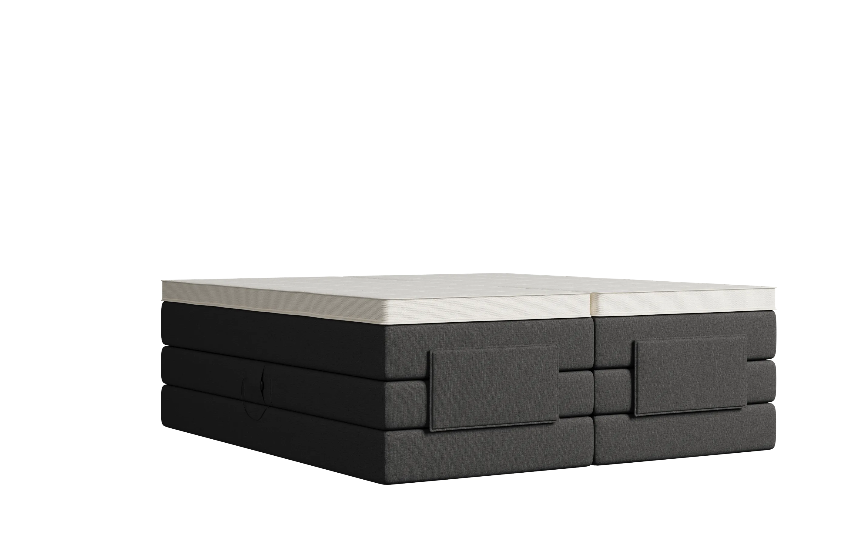 Selber Komfort, anderes Design: Das Bett erhältst du optional mit einem Topper, der in die Matratze integriert ist. Schäume und Federkerne sind identisch wie bei der Variante mit aufliegendem Topper. Optisch ist die Matratze nicht mit Textil, sondern mit einem weißen Doppeltuch bezogen.