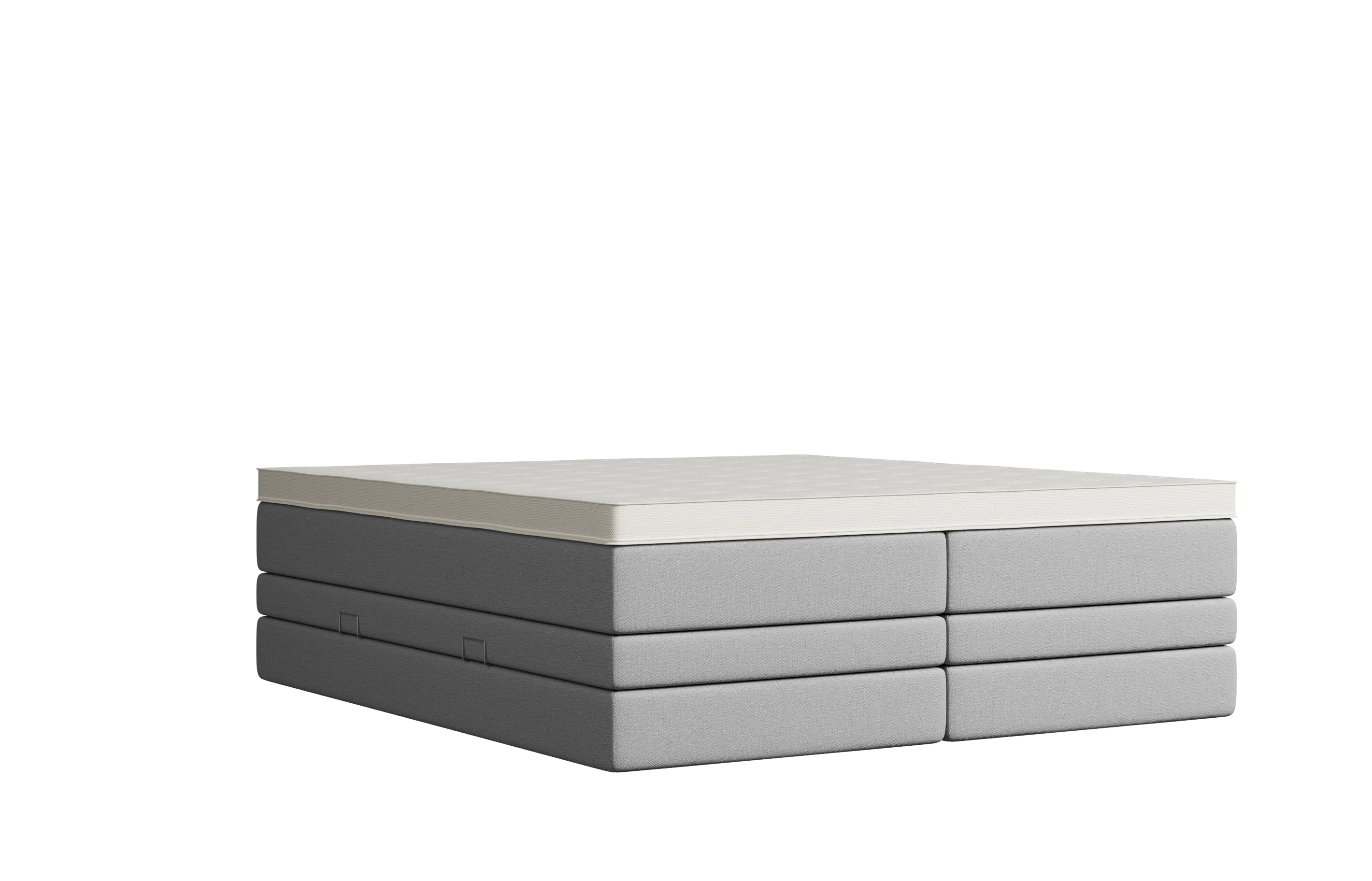 Selber Komfort, anderes Design: Das Bett erhältst du optional mit einem Topper, der in die Matratze integriert ist. Schäume und Federkerne sind identisch wie bei der Variante mit aufliegendem Topper. Optisch ist die Matratze nicht mit Textil, sondern mit einem weißen Doppeltuch bezogen.